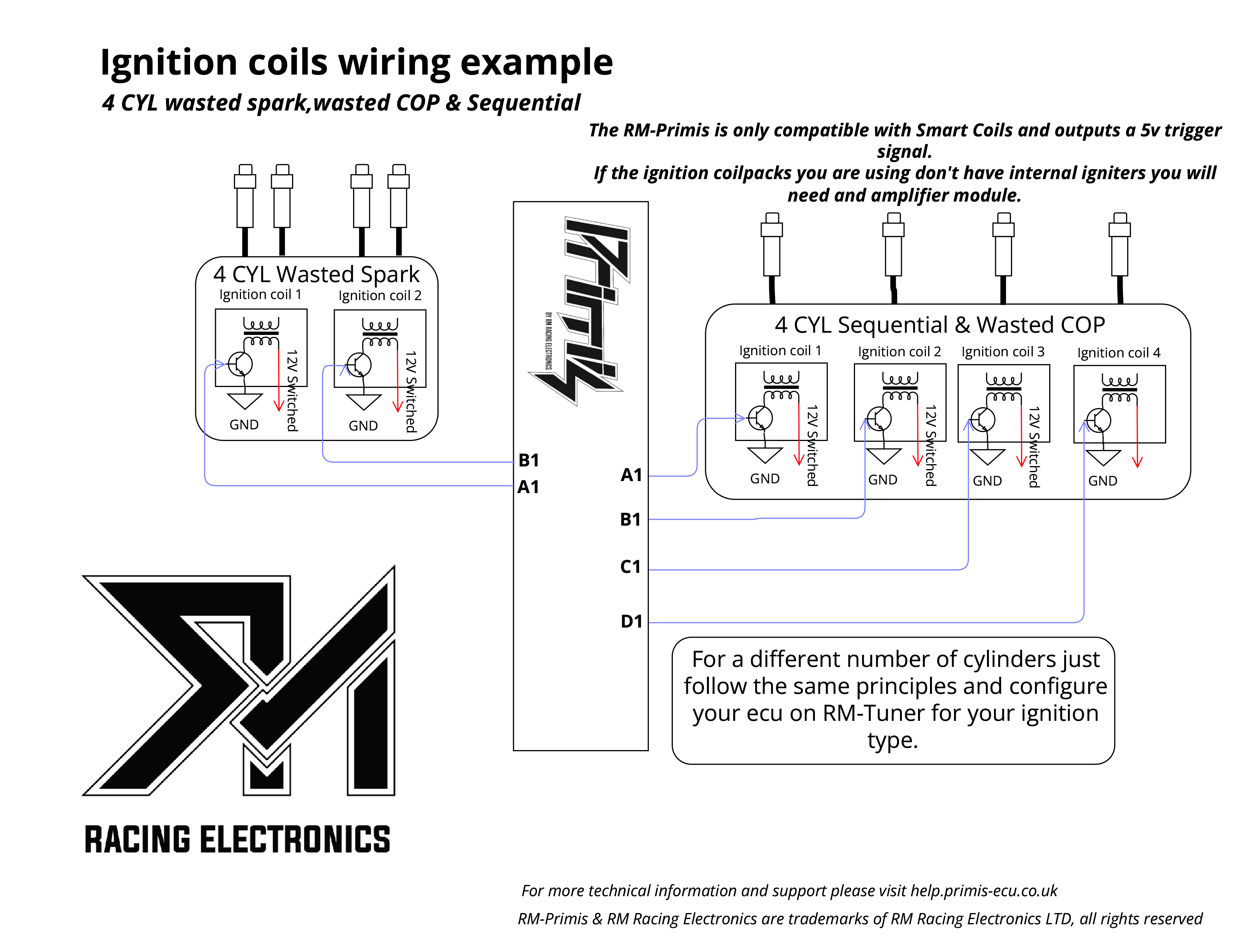 Find below an example of how to connect a 4-cylinder engine ignition system using a wasted spark coilpack, 4 individual coilpacks firing sequentially, or 4 individual coilpacks firing in wasted COP (paired).